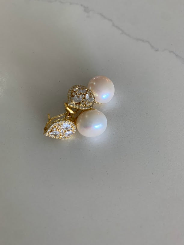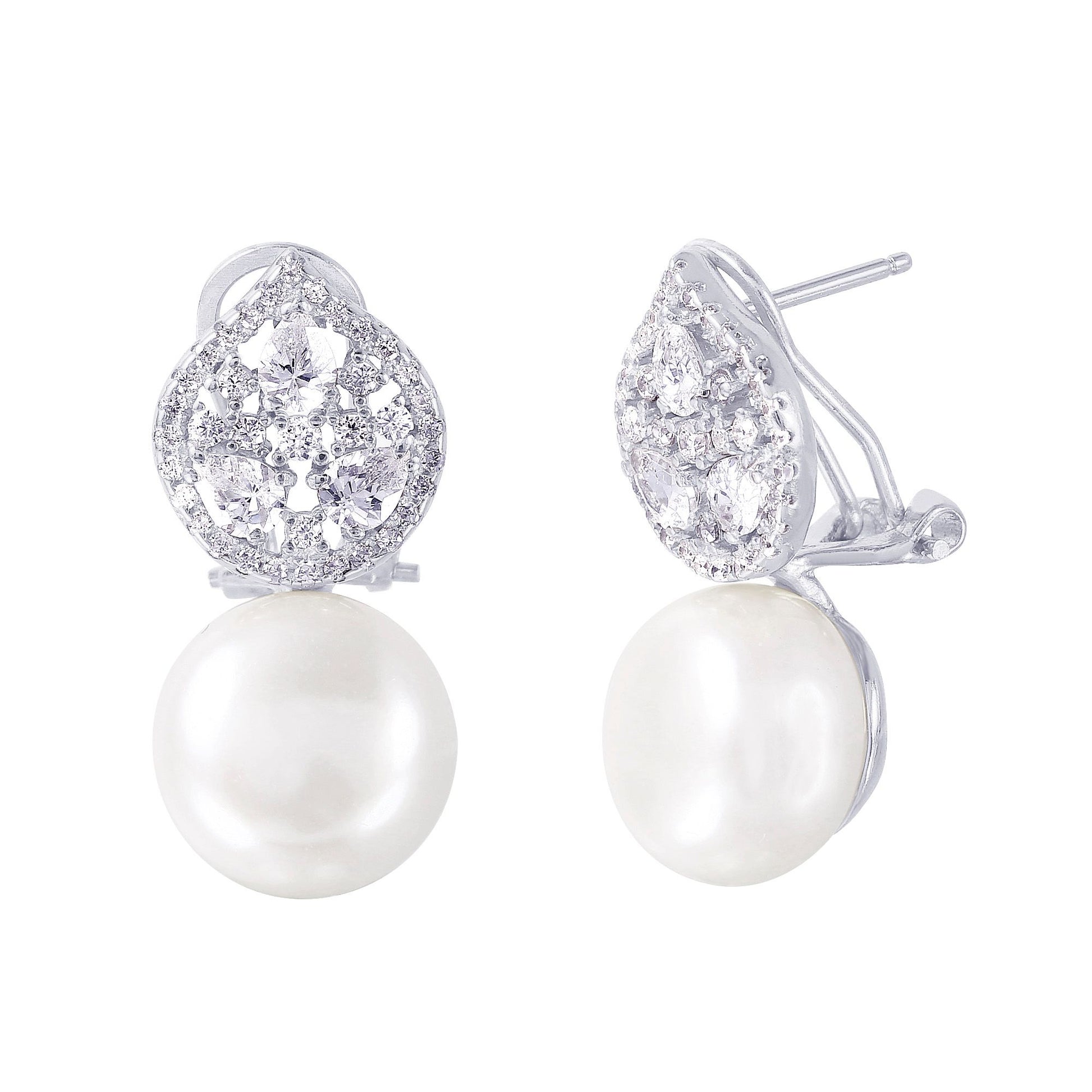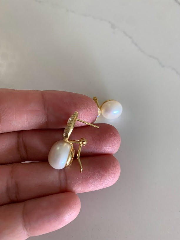 Large Pearl CZ Studs, Bridal Earrings, Bridesmaid Gift, Wedding Jewelry, Round 12MM Cream Pearl with Cubic Zirconia Pave and Baguette Post Earrings