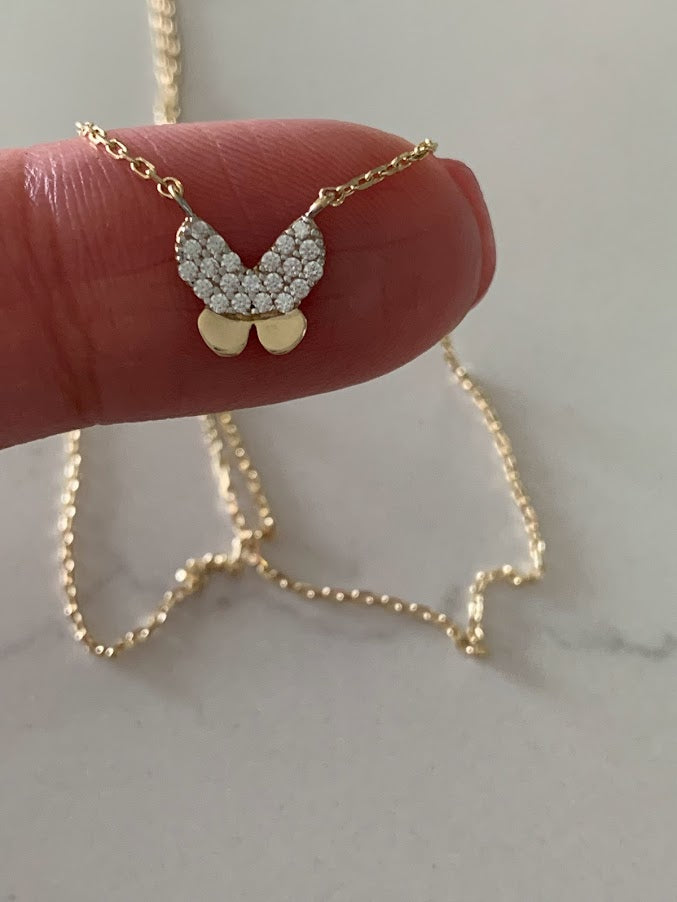 This beautiful 14K Gold Butterfly necklace can be worn as a choker, as a layering piece or part of a layering necklace set. It will add a statement to your outfit. It can be combined with multiple chains of different lengths to give the messy chains look. It comes available in gold color only.