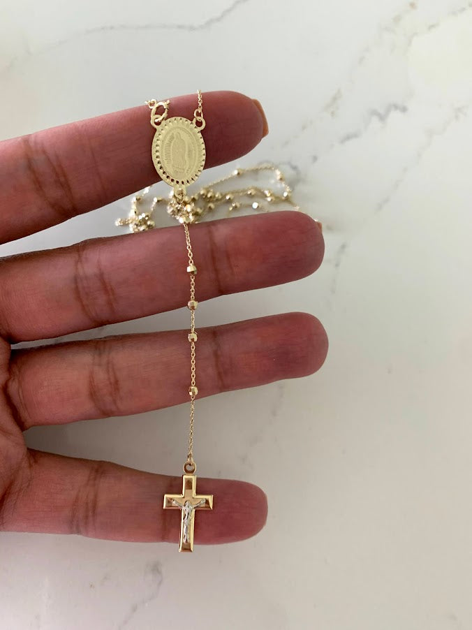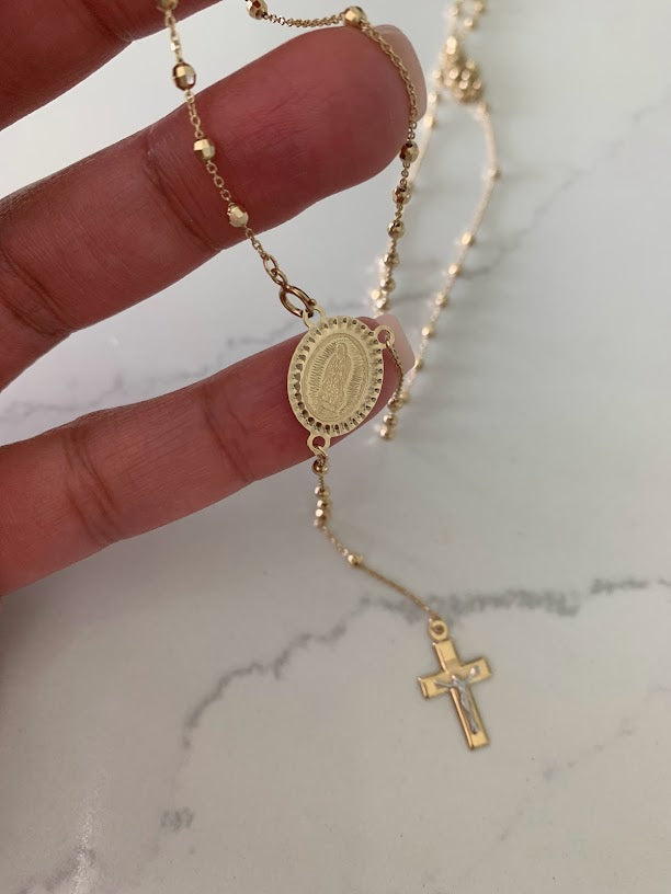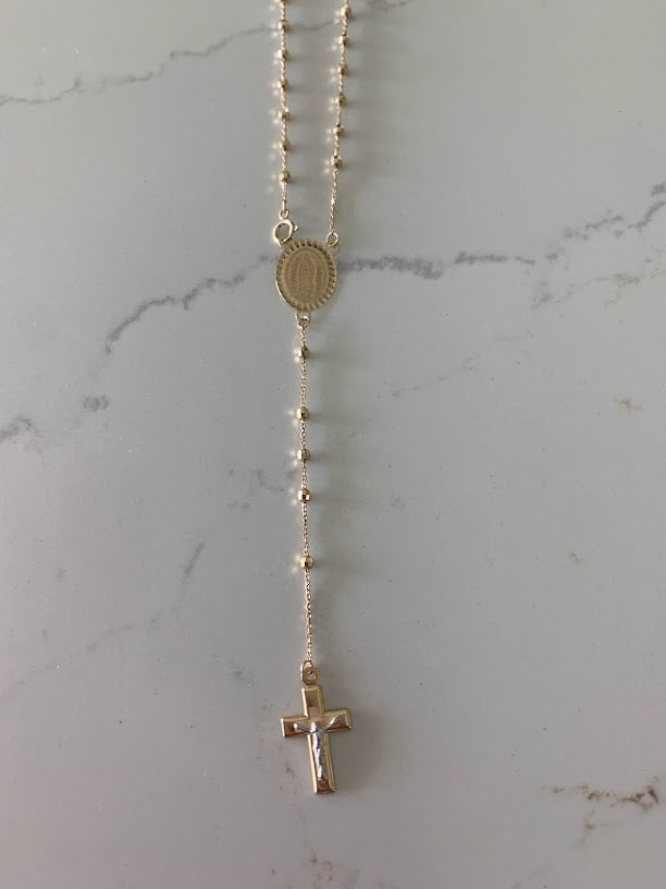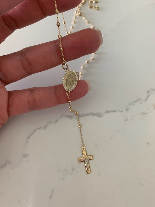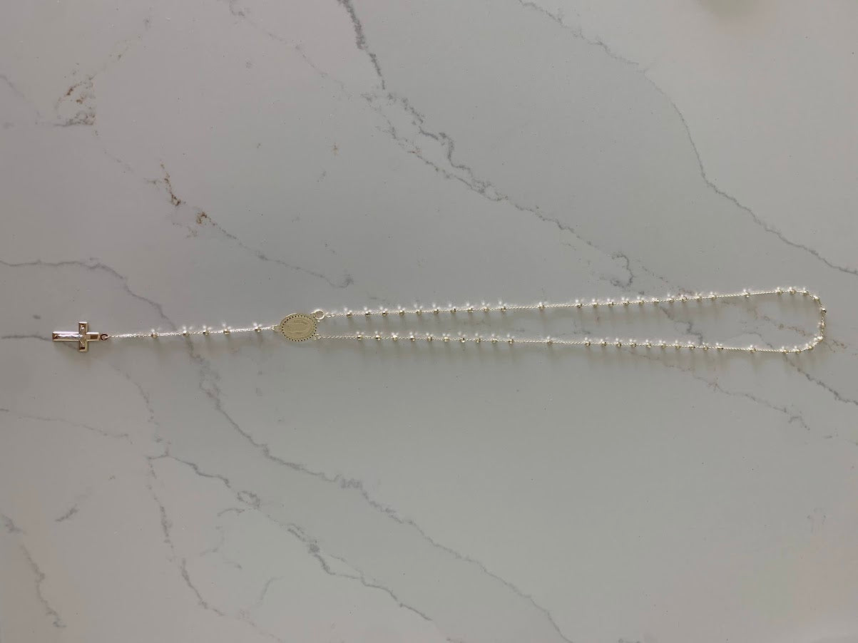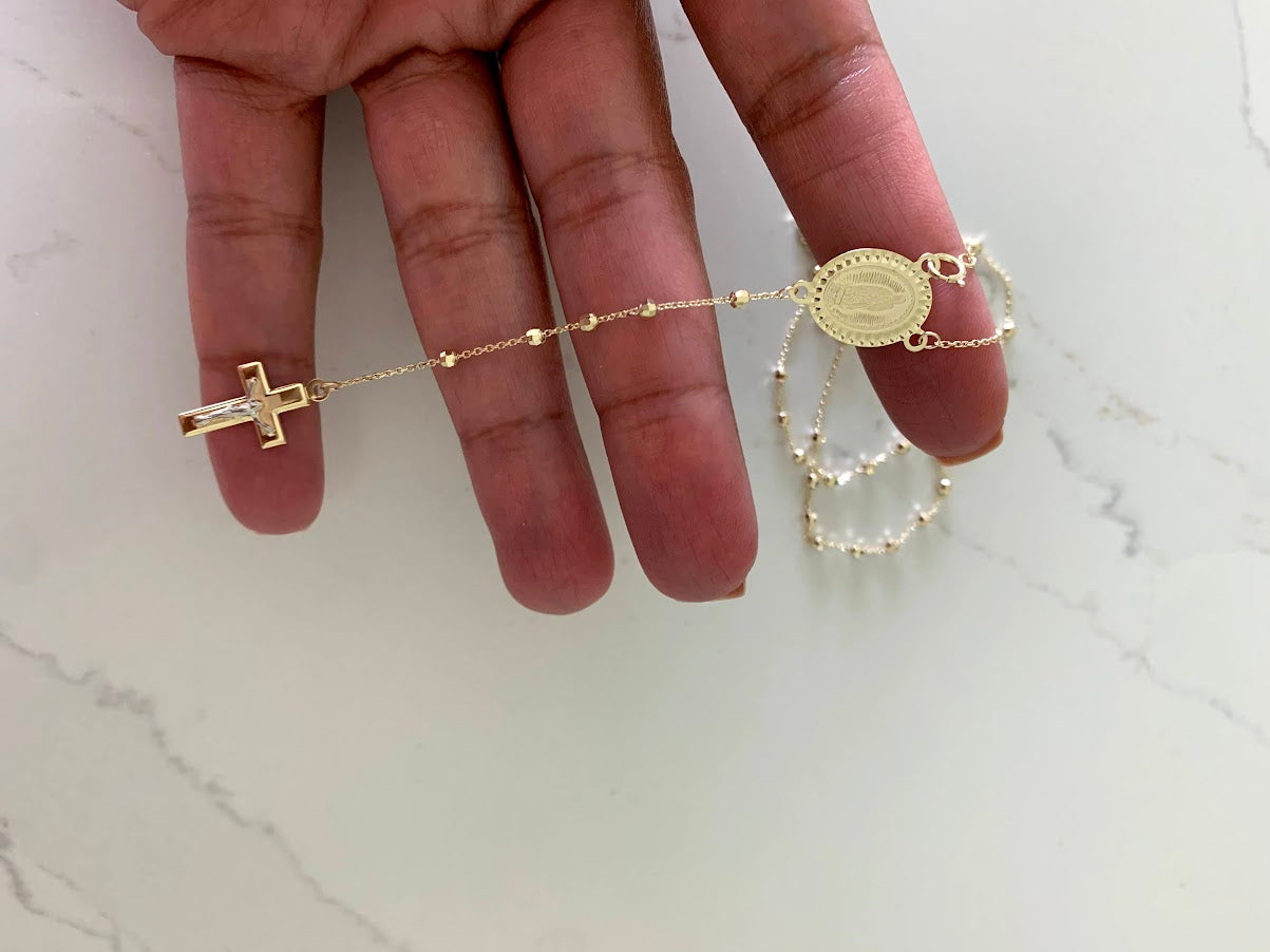 This 14K yellow gold rosary necklace is the perfect religious symbol of faith. Featuring a cross pendant, shiny diamond cut 2.5mm round beads, and a 20” chain, this necklace is a meaningful piece of Catholic jewelry. Its delicate design makes it an ideal gift for anniversaries, confirmations, 1st communion and other special occasions.