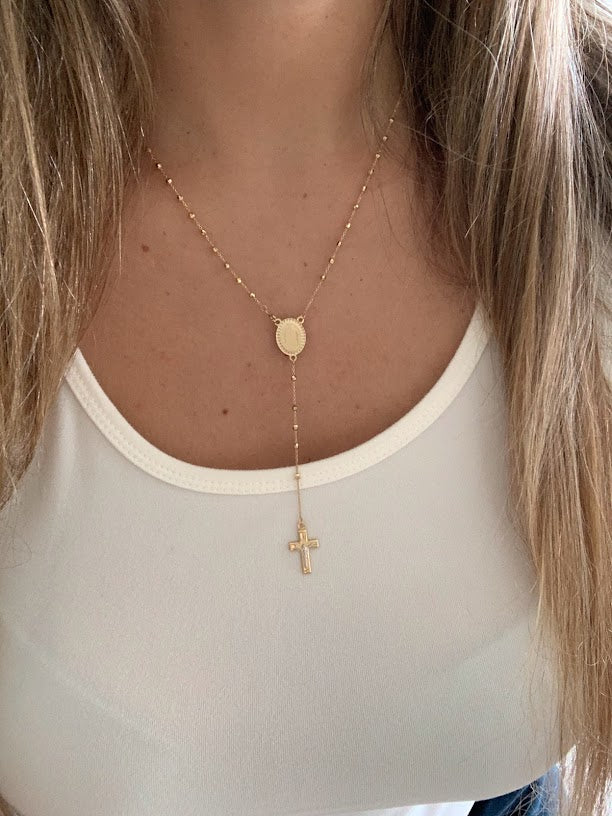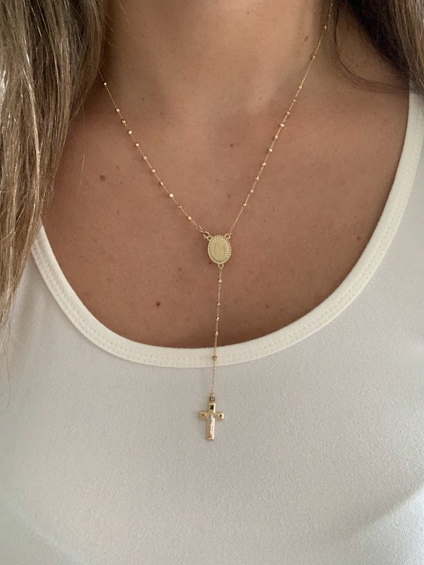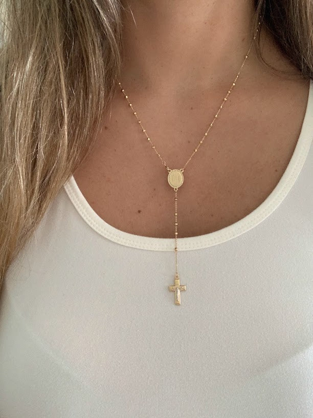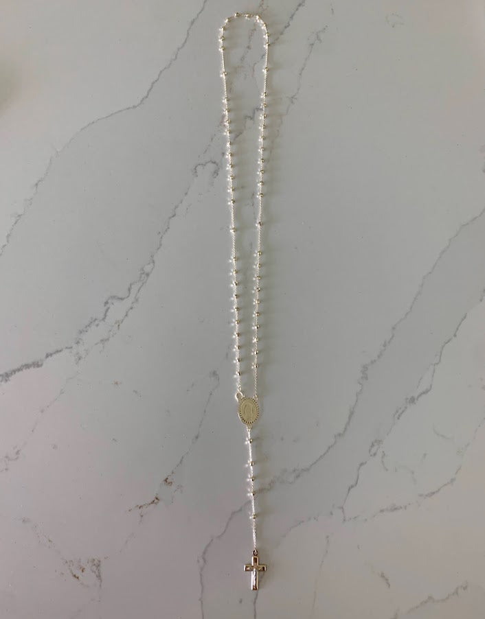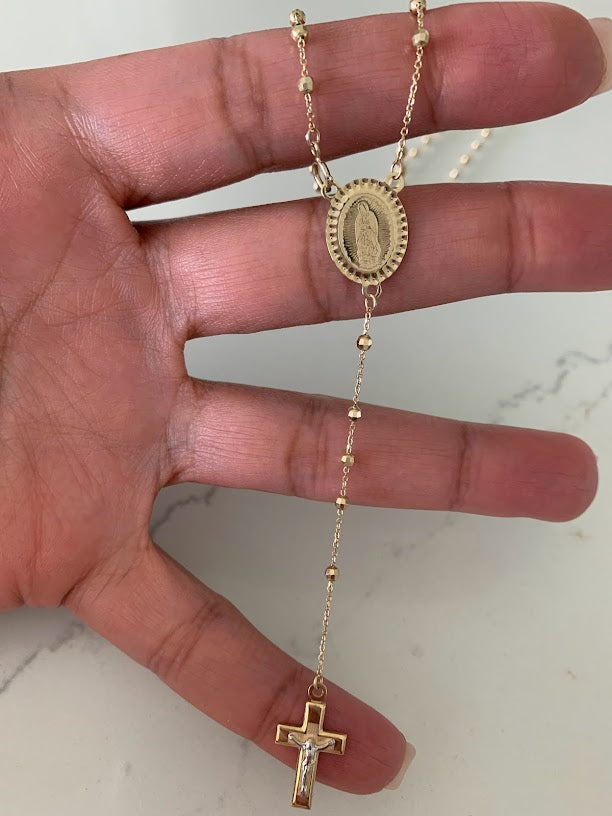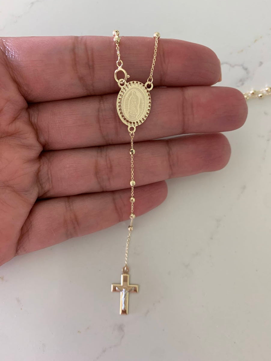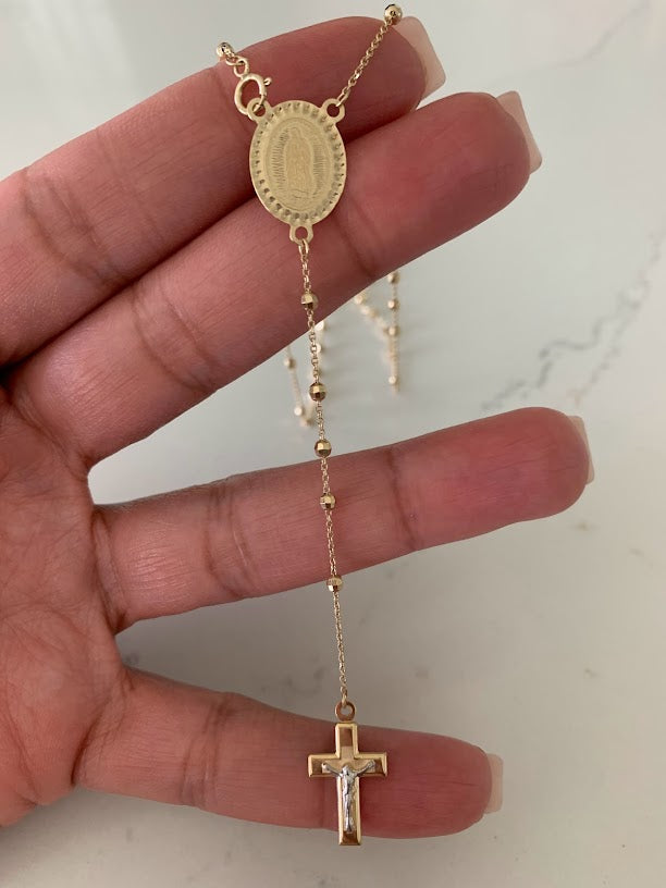 This 14K yellow gold rosary necklace is the perfect religious symbol of faith. Featuring a cross pendant, shiny diamond cut 2.5mm round beads, and a 20” chain, this necklace is a meaningful piece of Catholic jewelry. Its delicate design makes it an ideal gift for anniversaries, confirmations, 1st communion and other special occasions.