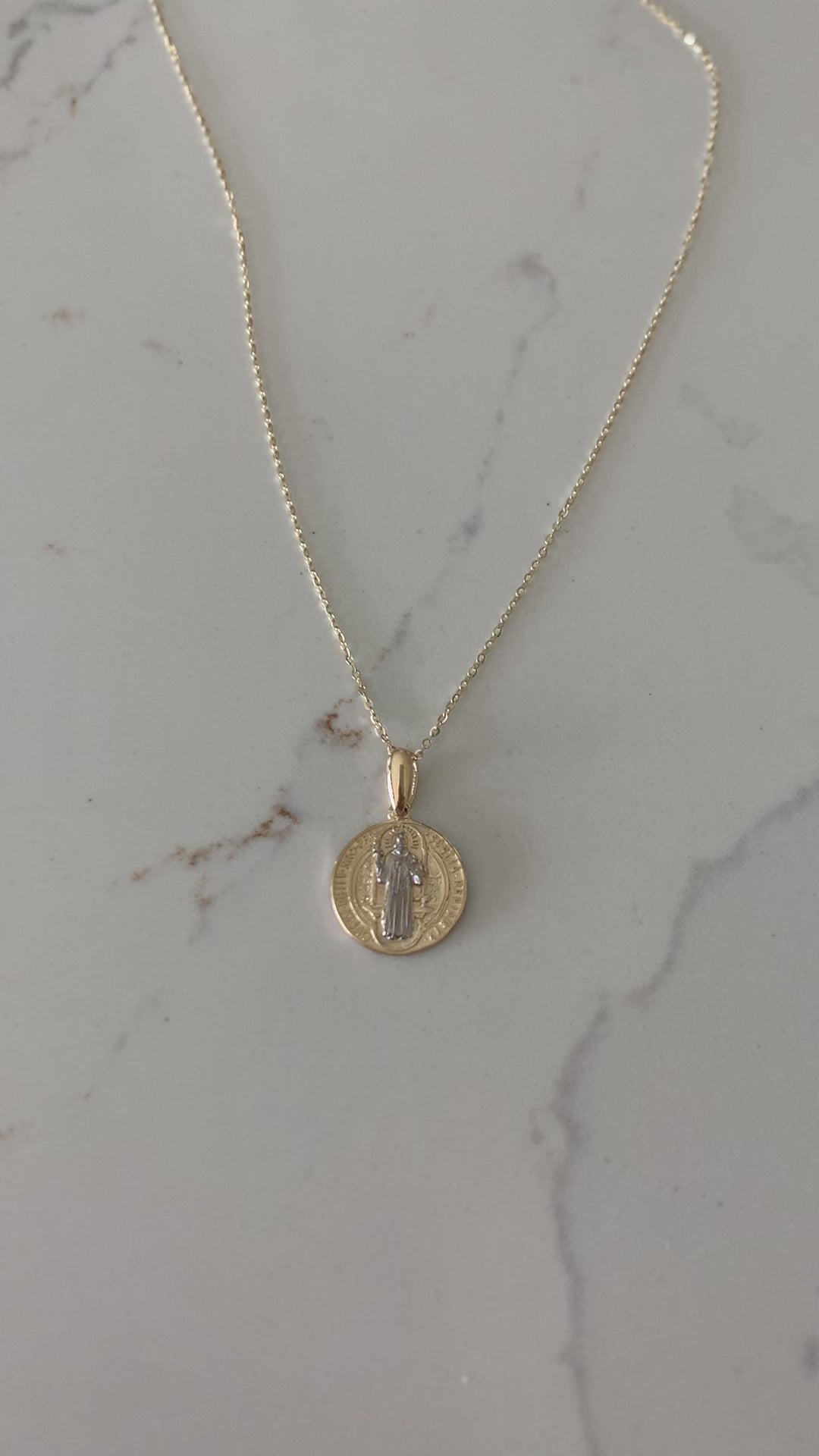 14K Gold Two Tone Saint Benedict Pendant on a Shiny Chain | Delicate 14K YG Chain | 14K Gold Religious Necklace | Medium Saint Benedict