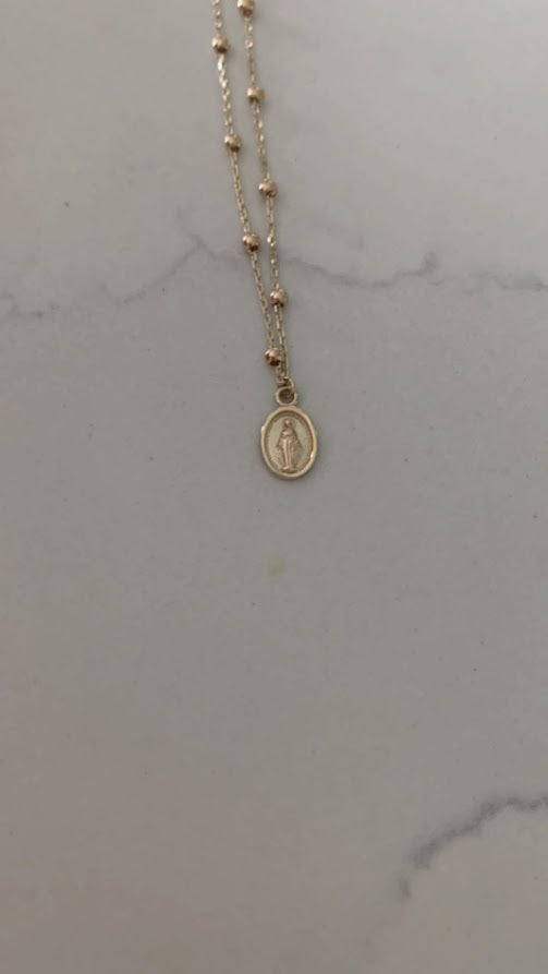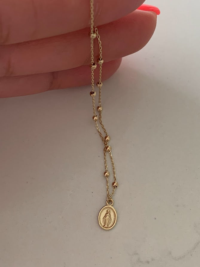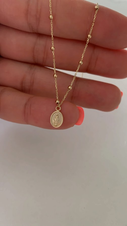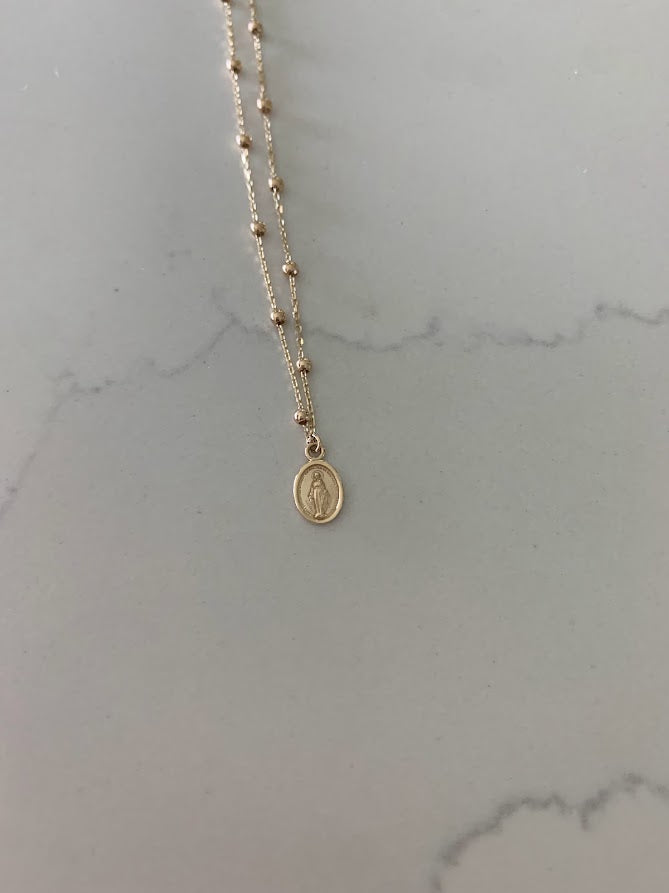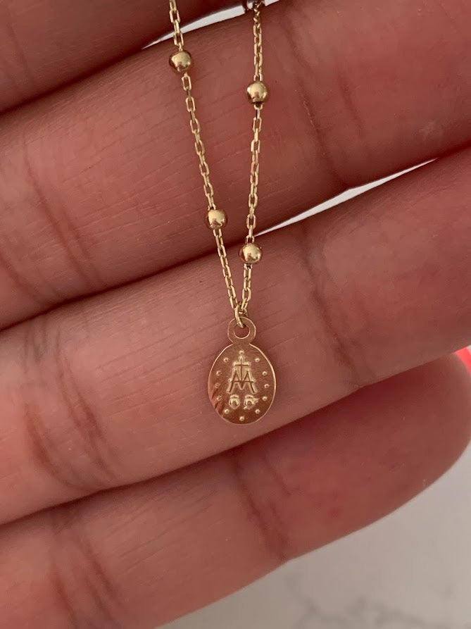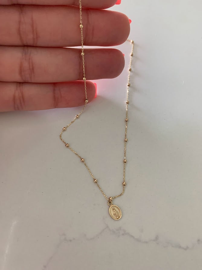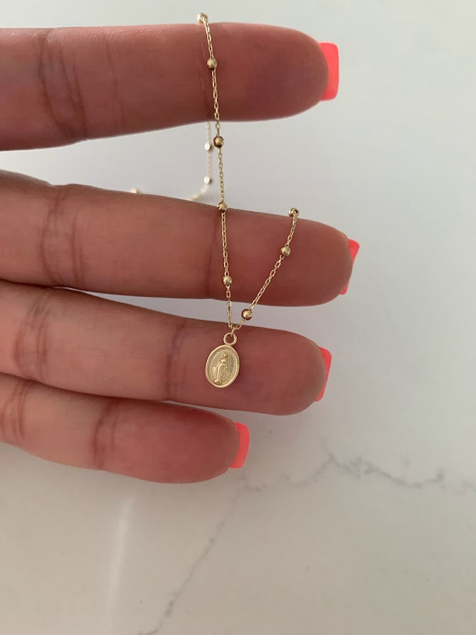 14K Yellow Gold Dainty Solid Gold Miraculous Virgin Mary, Tiny Virgin Medal Necklace, Religious Jewelry For Women, Virgin Mary Necklace,  Beaded Chain