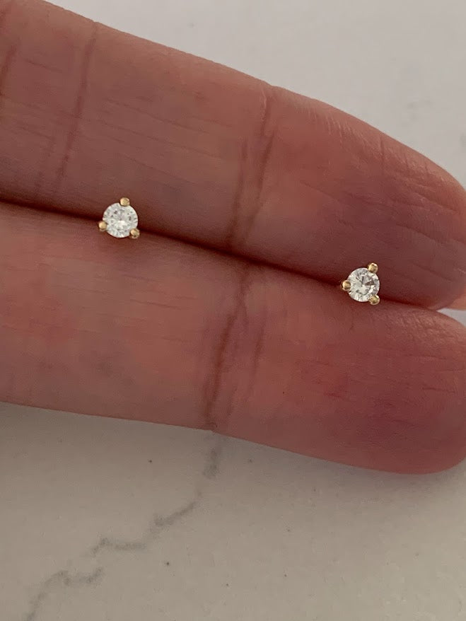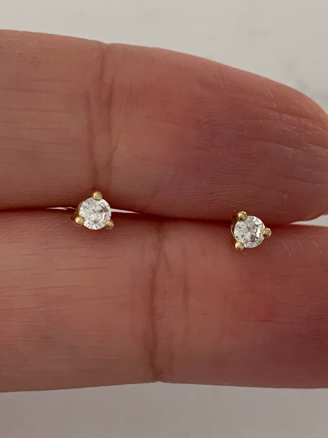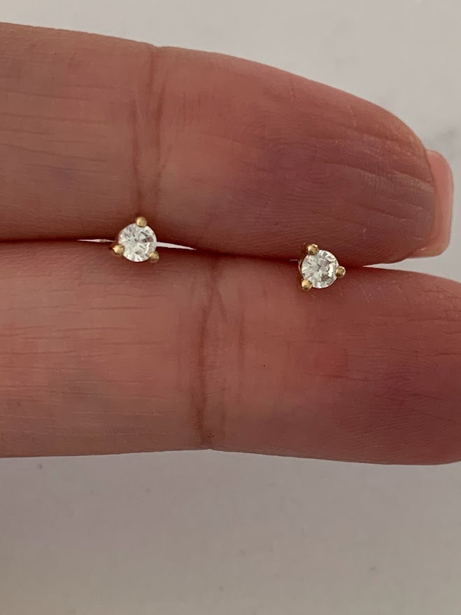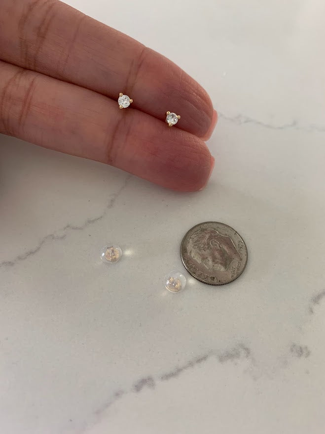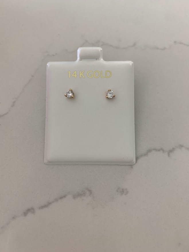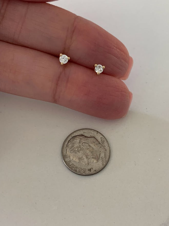 4MM 14K Gold Pair Earrings, 14k Solid Gold, Cubic Zirconia, Low Profile, Small Three Prong, Minimalist Stud Earrings