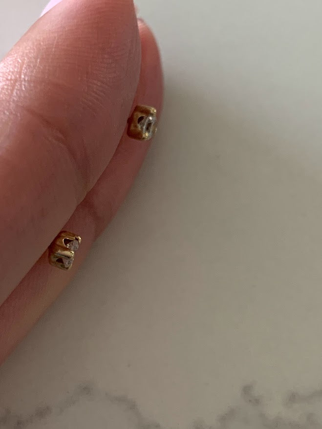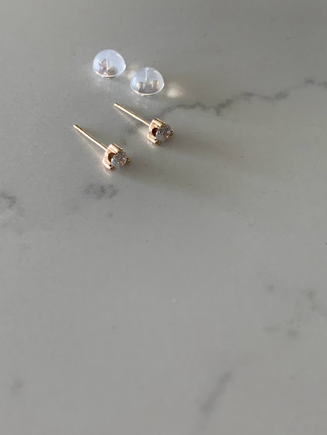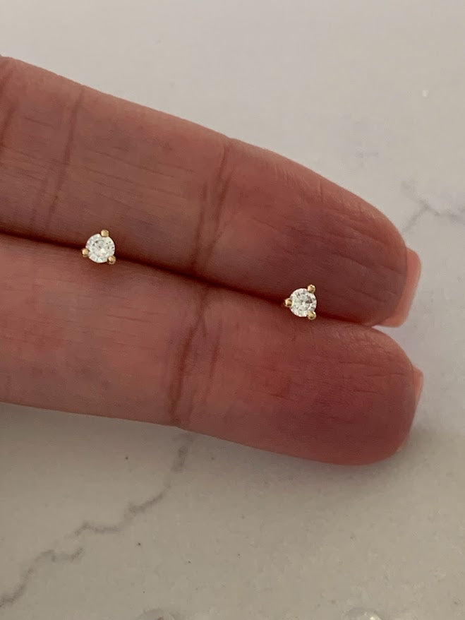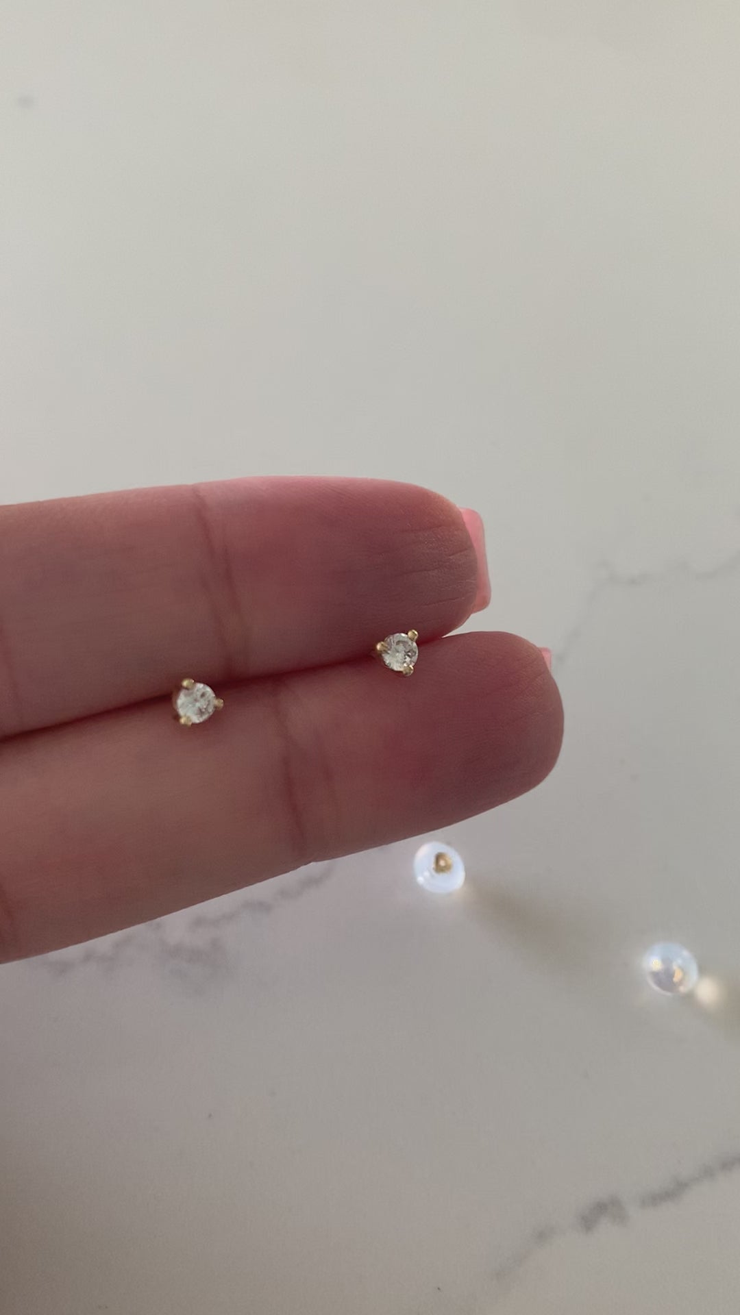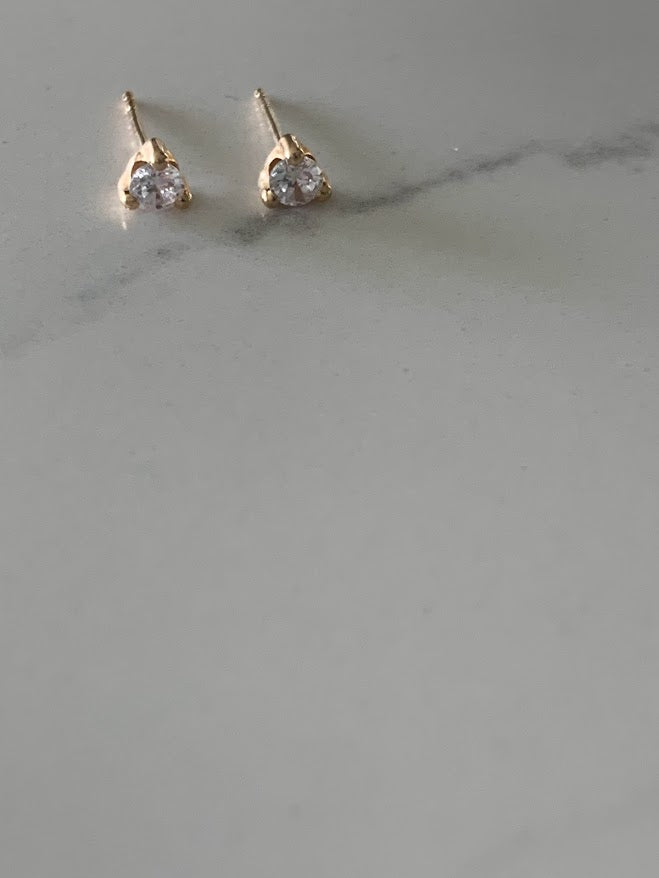 4MM 14K Gold Pair Earrings, 14k Solid Gold, Cubic Zirconia, Low Profile, Small Three Prong, Minimalist Stud Earrings