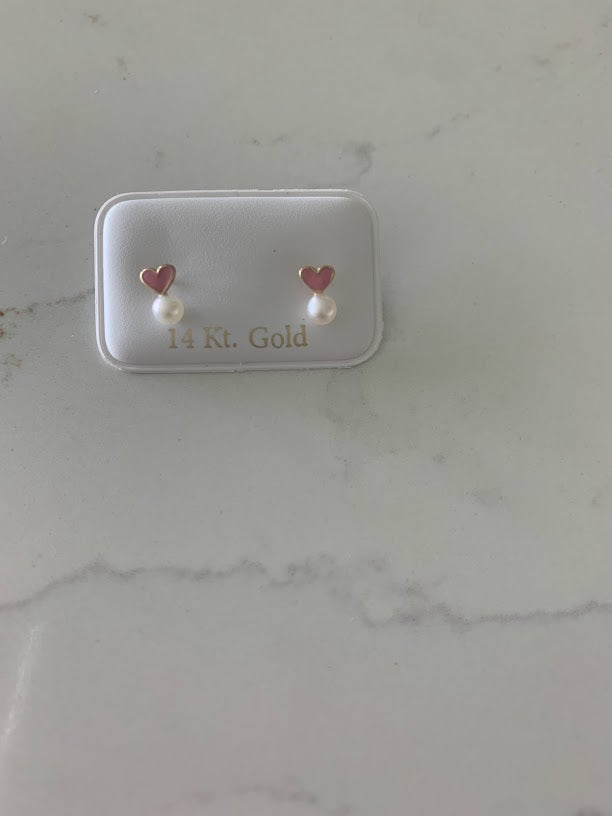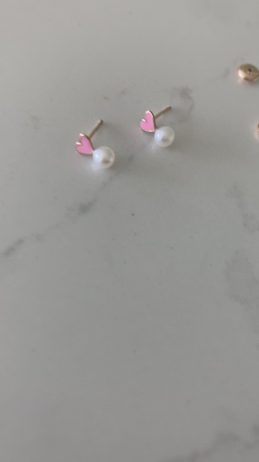 14K Solid Gold Pearl Heart Earrings | Dainty Pink Hearts Fresh Water Pearl Stud Earrings | Pearl Earrings | Pearl Studs | Girl Studs | Pink Heart Earrings