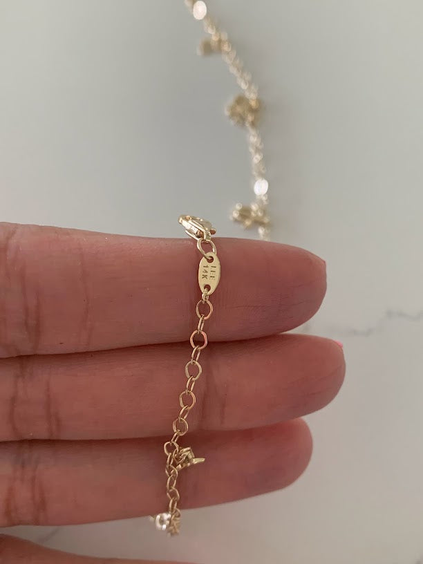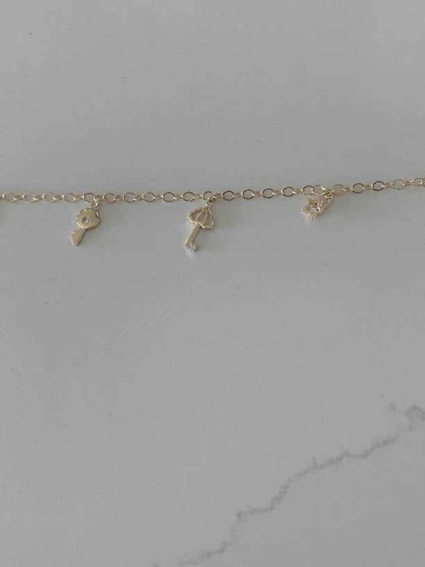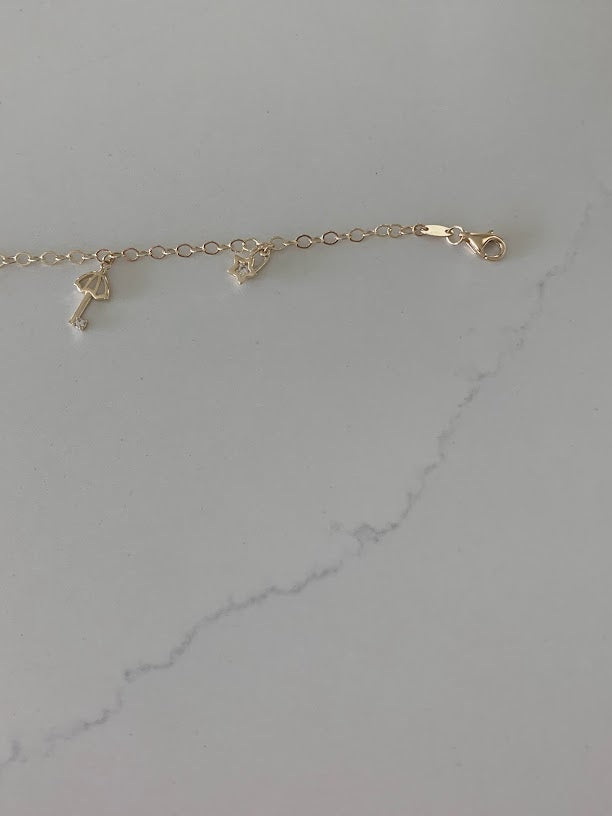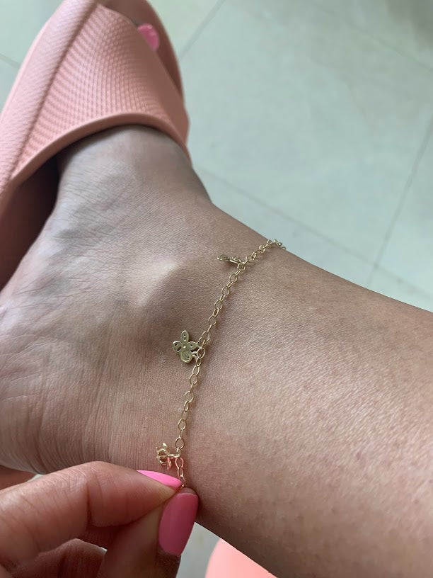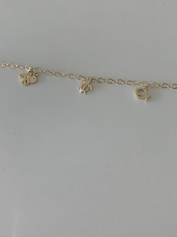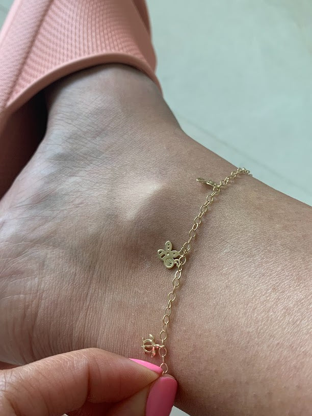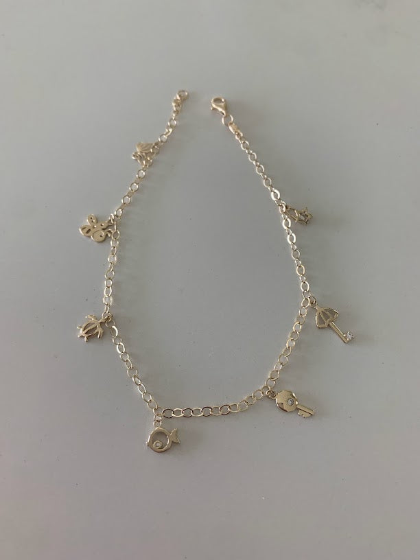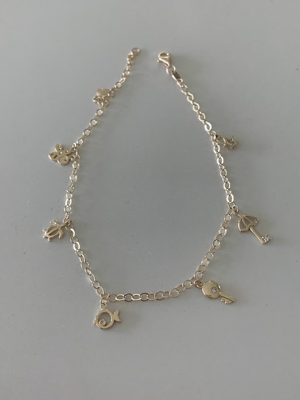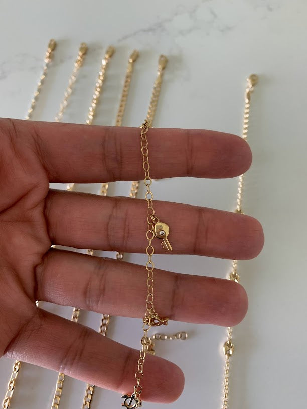 14K Gold Cable Anklet with Pendants, Bee, Key, Star, Turtle, Butterfly, Fish, Umbrella, Real 14K Gold Anklet, Gold Ankle Bracelet for Women