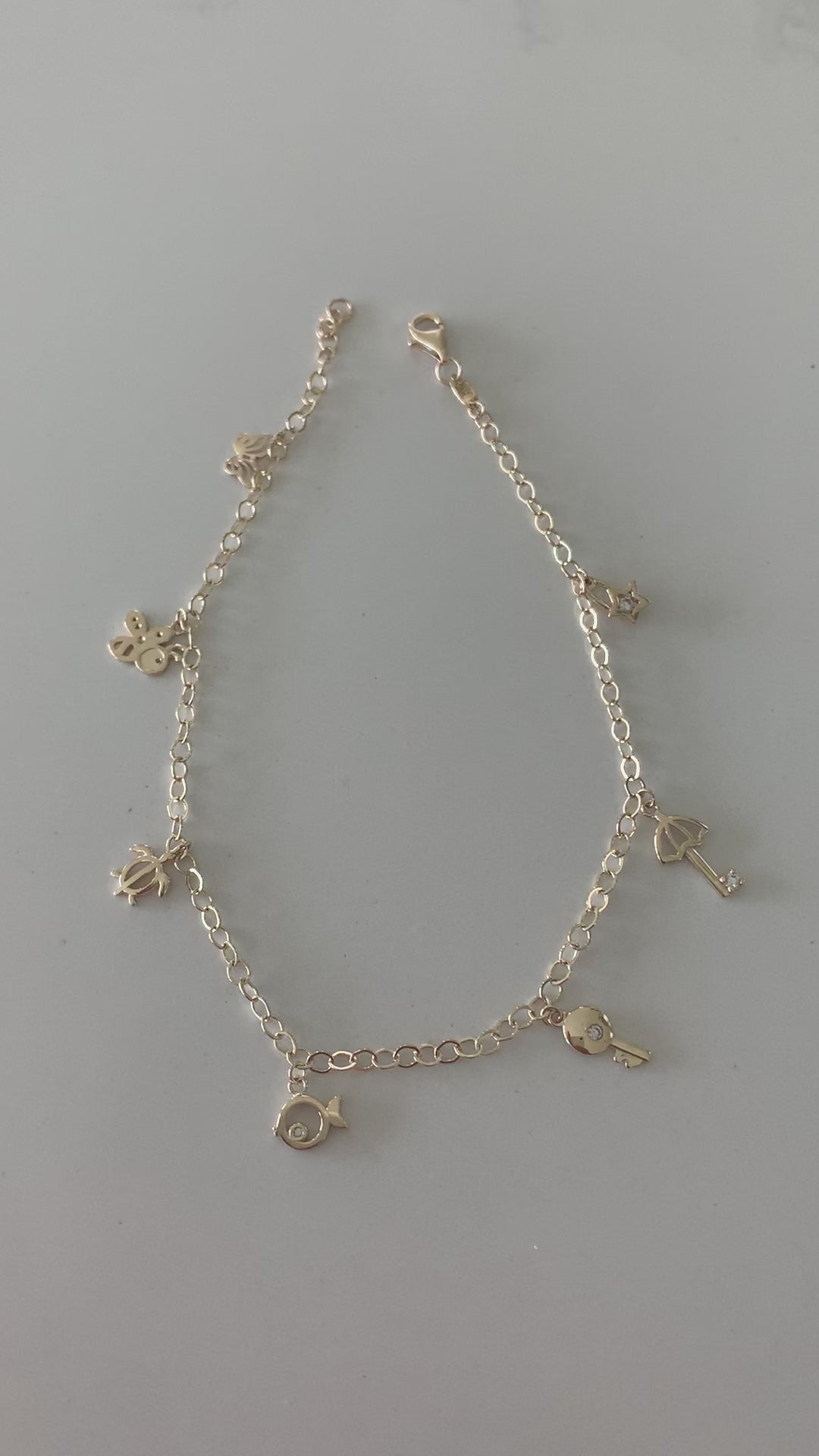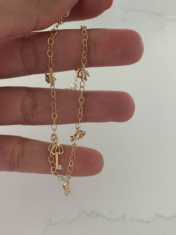 This 14K Gold Cable Anklet is an eye-catching piece of jewelry for women. It includes a bee, key, star, turtle, butterfly, fish, and umbrella pendants, a real 14K gold anklet with multiple pendants for a unique and stylish finish.